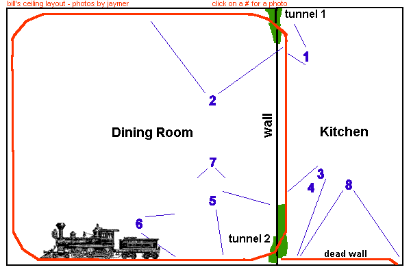 are some shots from Bill's layout, which runs around ABOVE his dining room. The tunnels in the pics show the train
